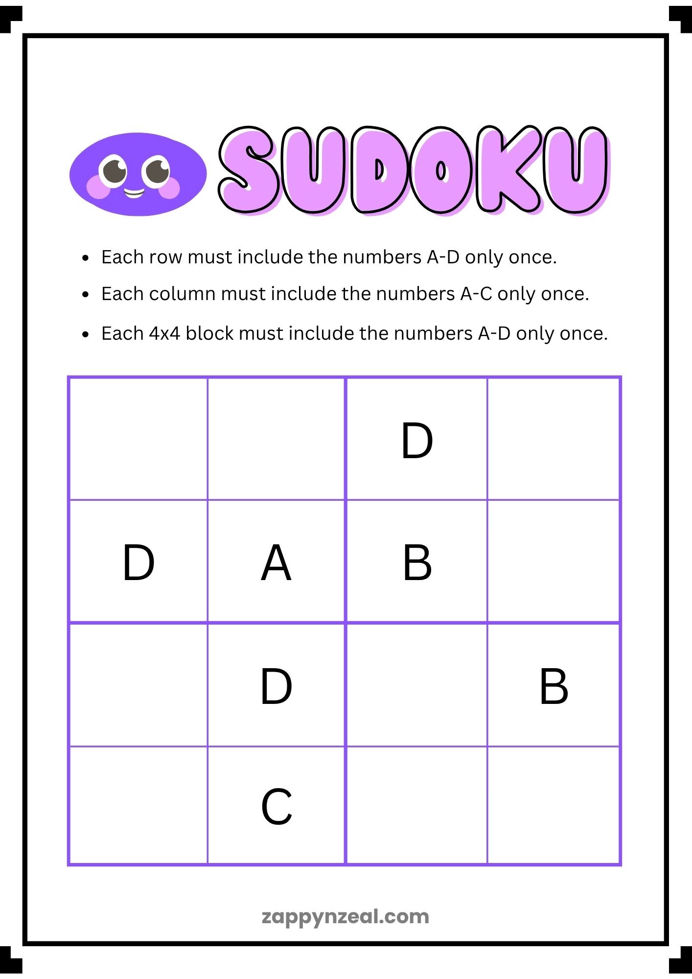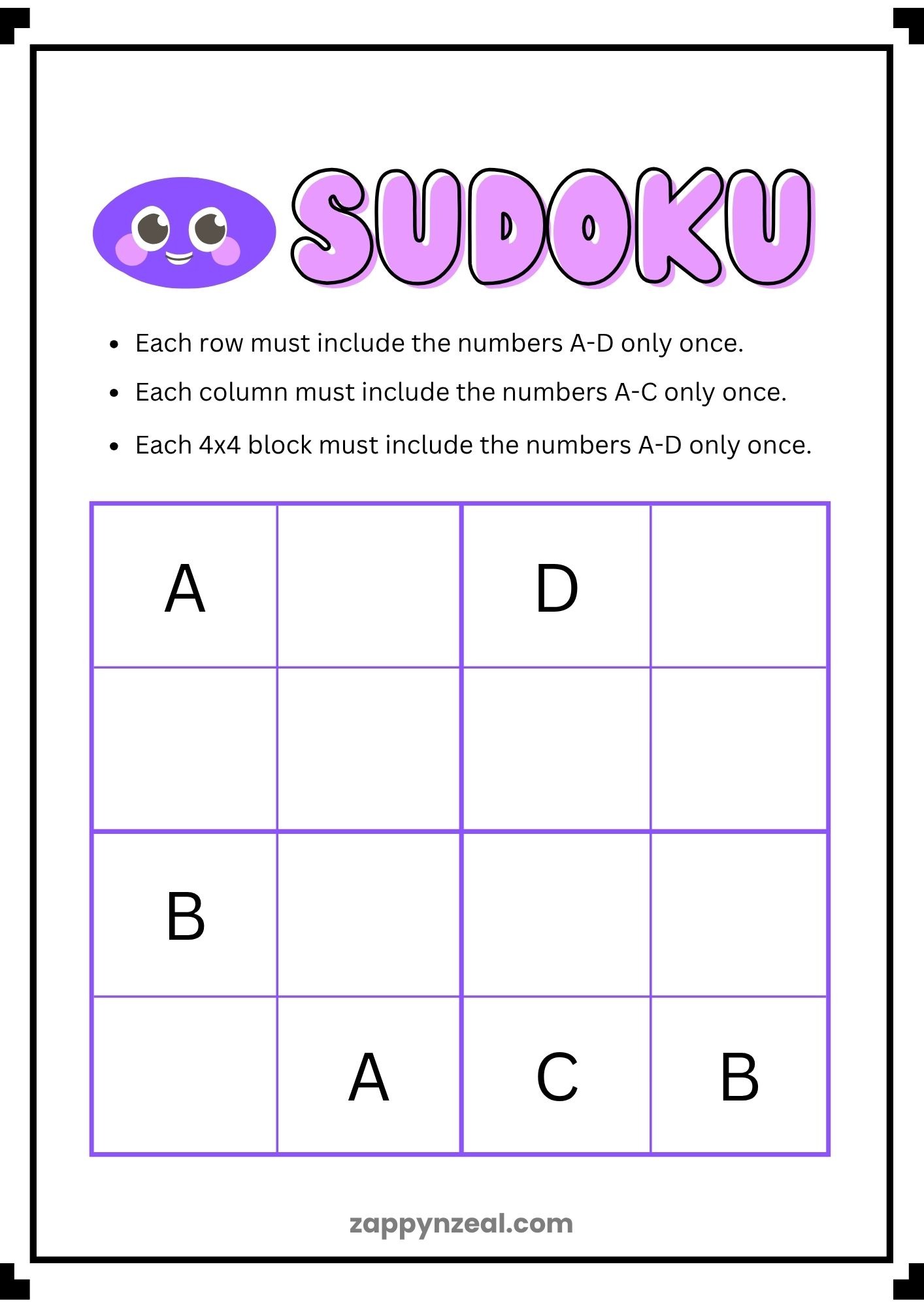 The name Sudoku comes from Japanese, meaning “digit-single.” The puzzle itself was popularized in the West by Dell Magazines in 1979 under the name Number Place. Boosts concentration and logical thinking, enhances pattern recognition and problem-solving skills. Offers a calming, meditative challenge that’s great for mental fitness. Children can solve this beginner level sudoku based on numbers and alphabets which is fun and engaging for their growing mind.
